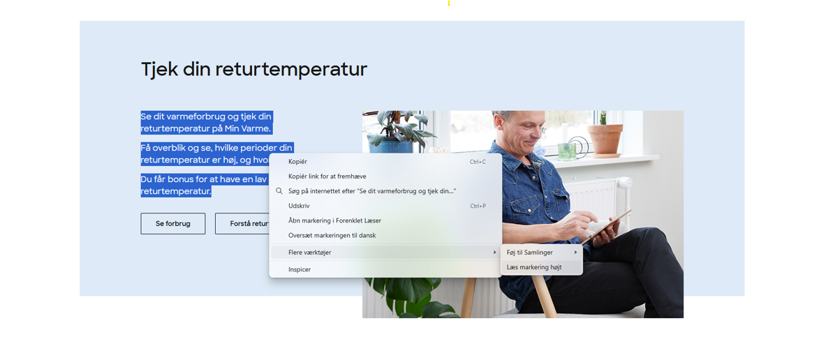 Markér den tekst, du vil have læst højt. Højreklik på din mus, og hvil musen på ’Flere værktøjer’. Tryk derefter på ’Læs højt herfra’.